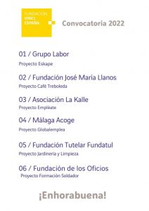 La Fundación apoya acciones de agentes que luchan contra la exclusión, a través del acompañamiento realizado por trabajadores del Grupo, que se implican de manera continuada, aportando su dedicación en proyectos que ellos mismos impulsan. Asimismo, evalúa las propuestas de apadrinamiento de los colaboradores y las respalda con soporte económico. Además, facilita que los trabajadores puedan poner en marcha o colaborar con los distintos proyectos.
